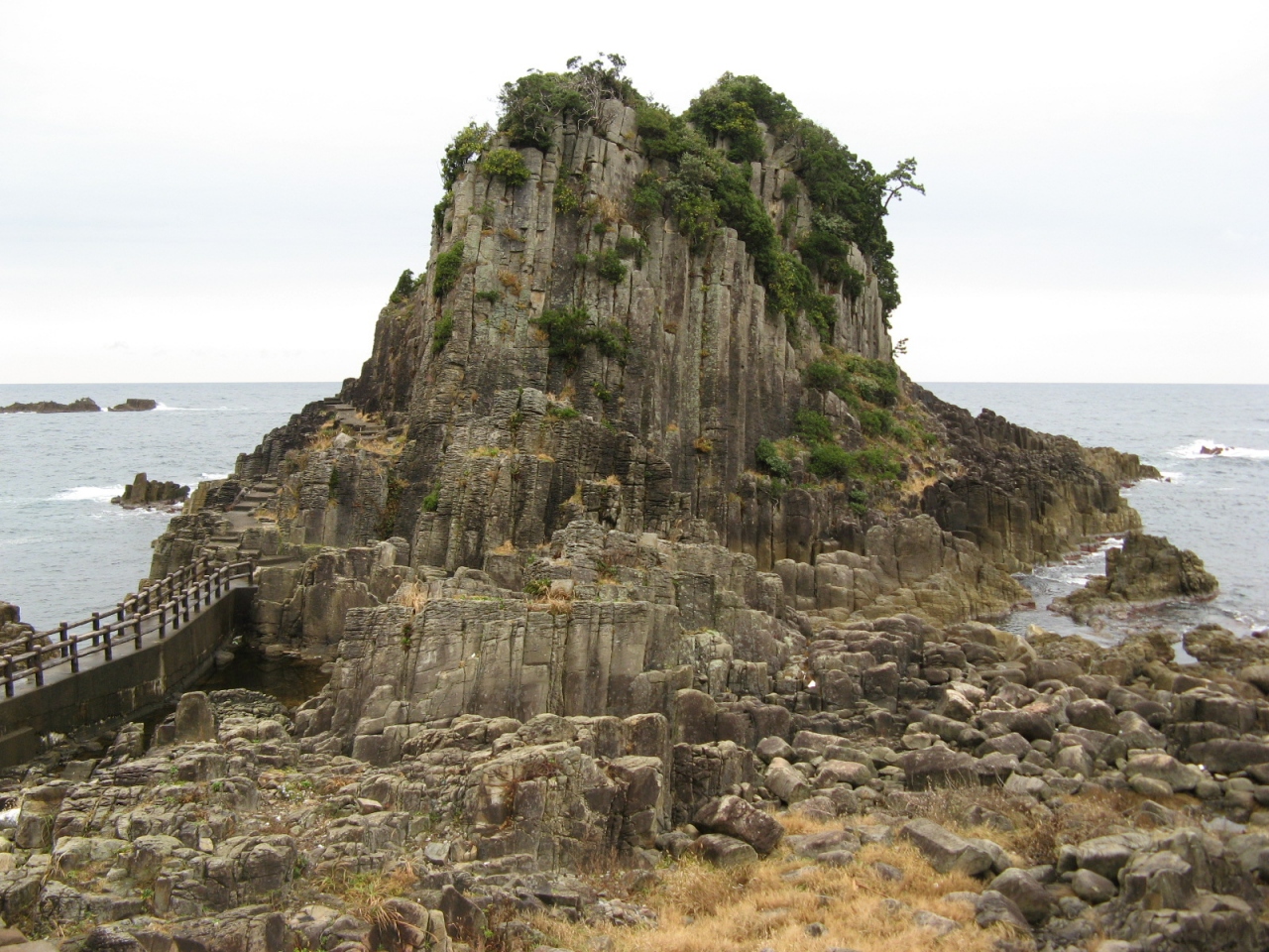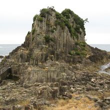 北陸自動車道福井北ICから車で50分、東尋坊と越前岬の中間ぐらい国道305号沿いにあります。近くの駐車場から小さな橋を渡って鉾島に行くことができます。日本海の荒波に浸食された高さ約50メートルの柱状の岩場で、遊歩道が整備されていて、断がいの上には松が生え、地蔵が安置されています。
