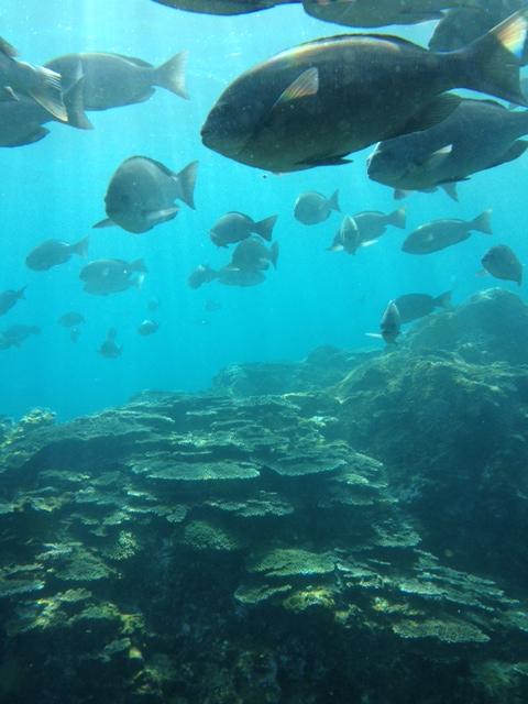 外に出て、海中公園に行きますが、冬は透明度が高くお薦めです。海中公園の廻りに柵があるのかと思うほど、廻りに魚が多くいて驚きました。実際には柵はないですが、魚が多いのは、もともと魚が多いエリアにこの施設を作ったのと、たまにここで餌付けをしているから、魚が多いのだそうです。サンゴが多いことにも驚きました。(沖縄の海と同じくらいサンゴが多いとのことです)