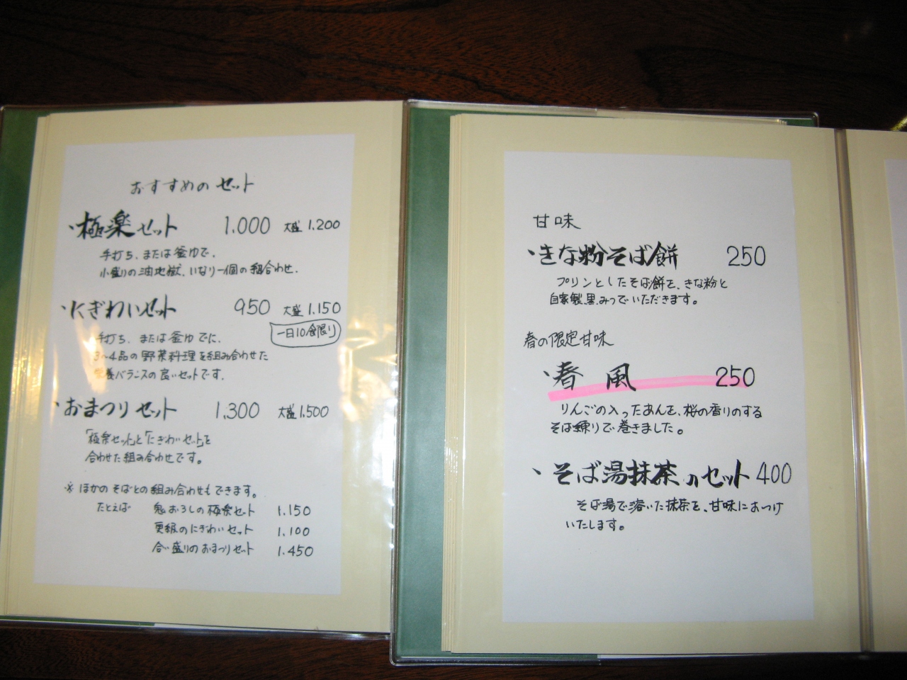 古い蔵を使っていると言う店は、静かで落ち着いた店の雰囲気。店内は1階と中2階に分かれていて、中2階の板張りの座敷にテーブルが置かれた席に通された。頂いたのは、私が、手打ち蕎麦と油地獄、いなりがセットになった“極楽セット大盛 1200円”、家内が手打ち蕎麦とサラダや炊き合わせの野菜料理などがセットになった“にぎわいセット大盛 1150円”です。蕎麦は細切りで香り豊か、汁は鰹節の効いた少し甘め、わさびは蕎麦の香りを無くすから付いておらず大根おろしとネギの薬味で頂いたが大変美味しかった。また、そばを揚げた、あんかけやきそばの“油地獄”も美味しかった。