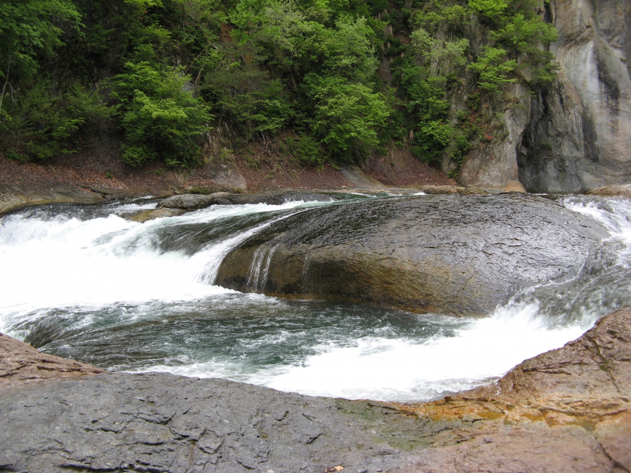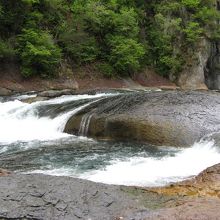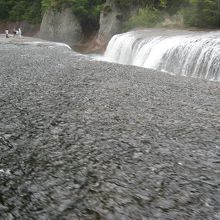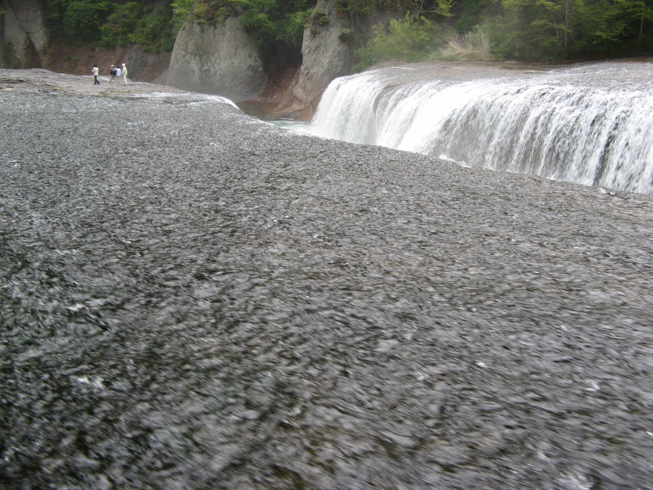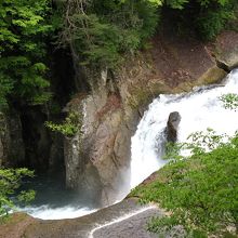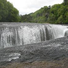 国道120号線沿いにあり、土産物店が並ぶところから10分ほど遊歩道を歩くと滝に出ます。『日本のナイアガラ』と言われていますが、それほど大きくなくかなり言い過ぎです。それでも、日本の普通の滝の様に上下に細い幅で落ちる滝ではなくて、ナイアガラの滝のような横幅のある滝で、水量も多くたいへん見応えがありました。景観に配慮してか、滝の周辺には柵がなく、滝の傍まで歩いていくことが出来、その迫力を間近に感じることが出来ますが、転落しないように注意が必要です。