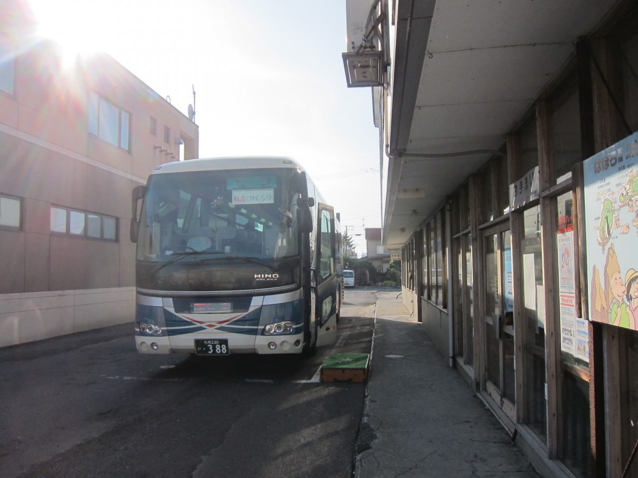 バスの車内は標準的な右2列、左2列の計4列で、羽幌までは約3時間の旅です。トイレも付いています。途中、砂川S.A.で5分ほどの休憩がありました。留萌までは高速道路を走り、留萌からは海沿いの一般道を走ります。羽幌方面向かって左側の車窓で海が見えます。また、風力発電の風車も見ることができました(@苫前)。羽幌では、旧国鉄羽幌駅だった羽幌ターミナルよりも、休憩を交える本社ターミナルの方が、町の中心の主要施設に近くて便利だと思います。目の前にはスーパーもありました。
