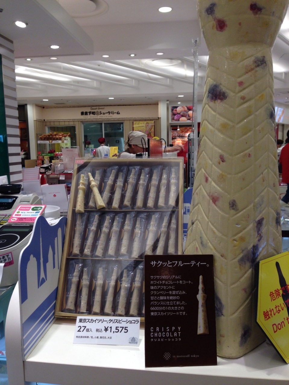 モロゾフの東京スカイツリークリスピーショコラもオススメです。6600分の1の大きさのホワイトチョコ。バラマキ土産にちょうど良い感じ。