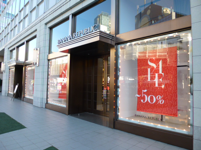 その「バナナリパブリック」の支店が六本木ヒルズノースタワーに入居しています。六本木通りを行き交う人からも目立ち、店のすぐ前は、ちょっとした広場になっています。セール期間に入っており、カッティングシートで貼られた赤い文字が目立っていました。