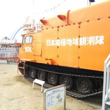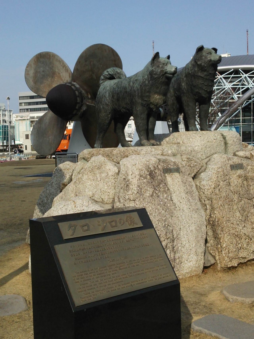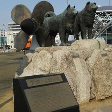 広場には、観測の時の雪上車、タロ、ジロの像があります。