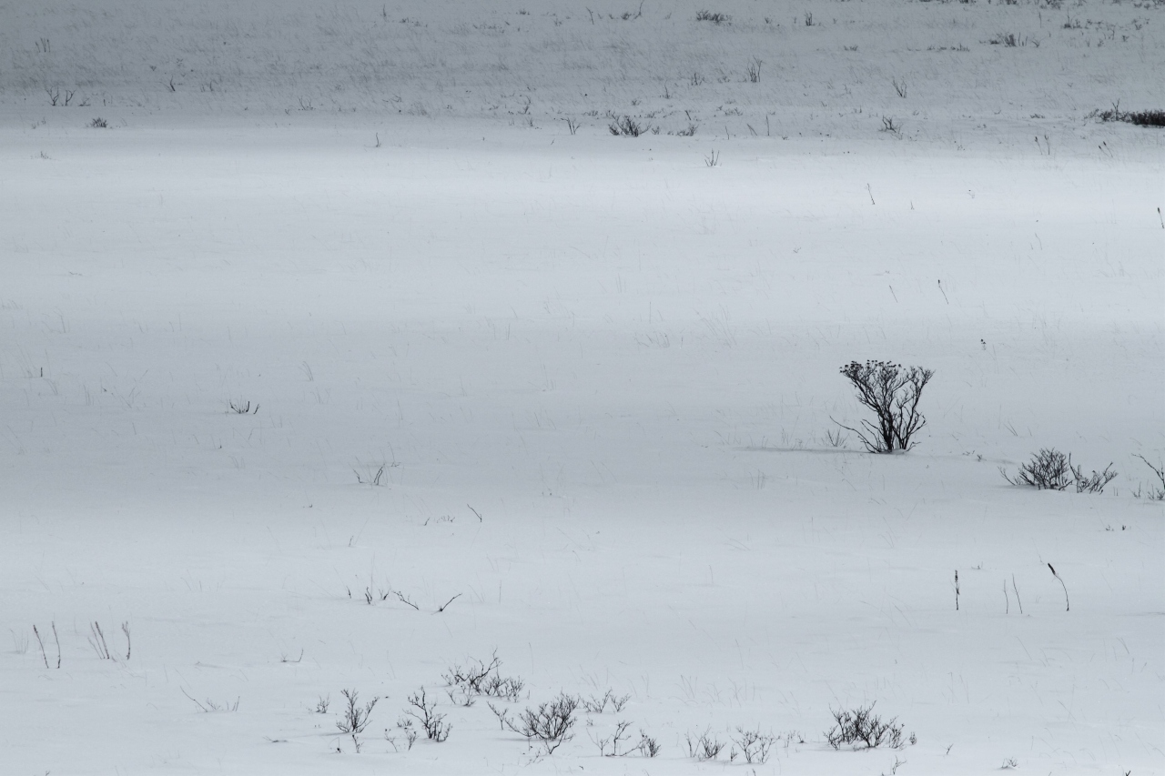 冬の雪原を見たくて出かけてみました。結構雪深かったので、普通の靴では湿原を歩くことはできませんでした。行ける所までということで、高台の広場から湿原(雪原)鑑賞。白い世界に目を奪われそうでしたよ。無の世界もいいですね。時折顔を見せる太陽