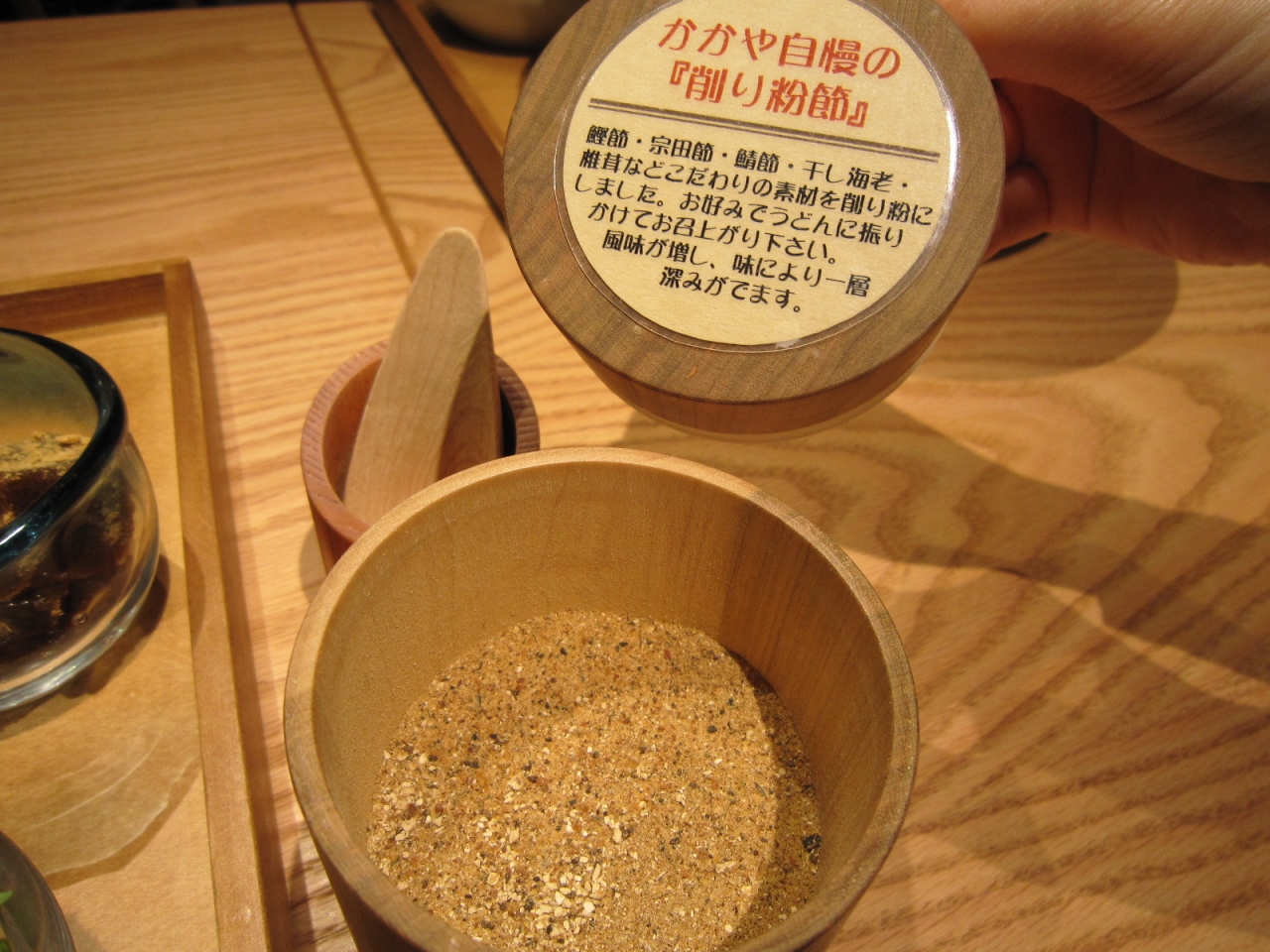 かかや自慢の「削り粉節」が置いてあり、これをかけると更にだしがきいて