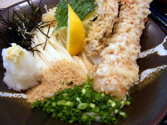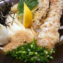 出てきたうどんには、鶏、海老、竹輪がトッピングされています。