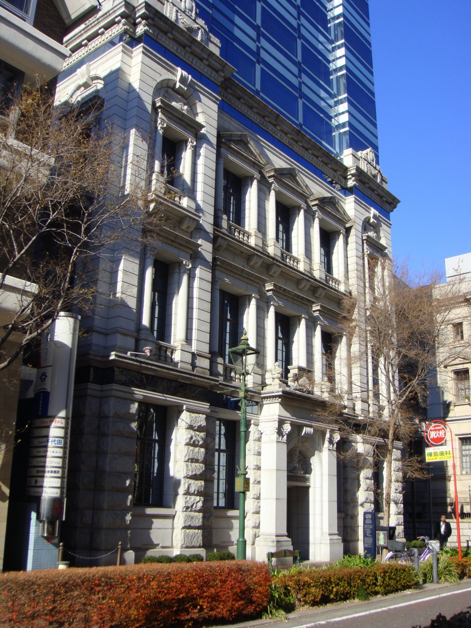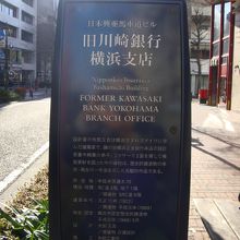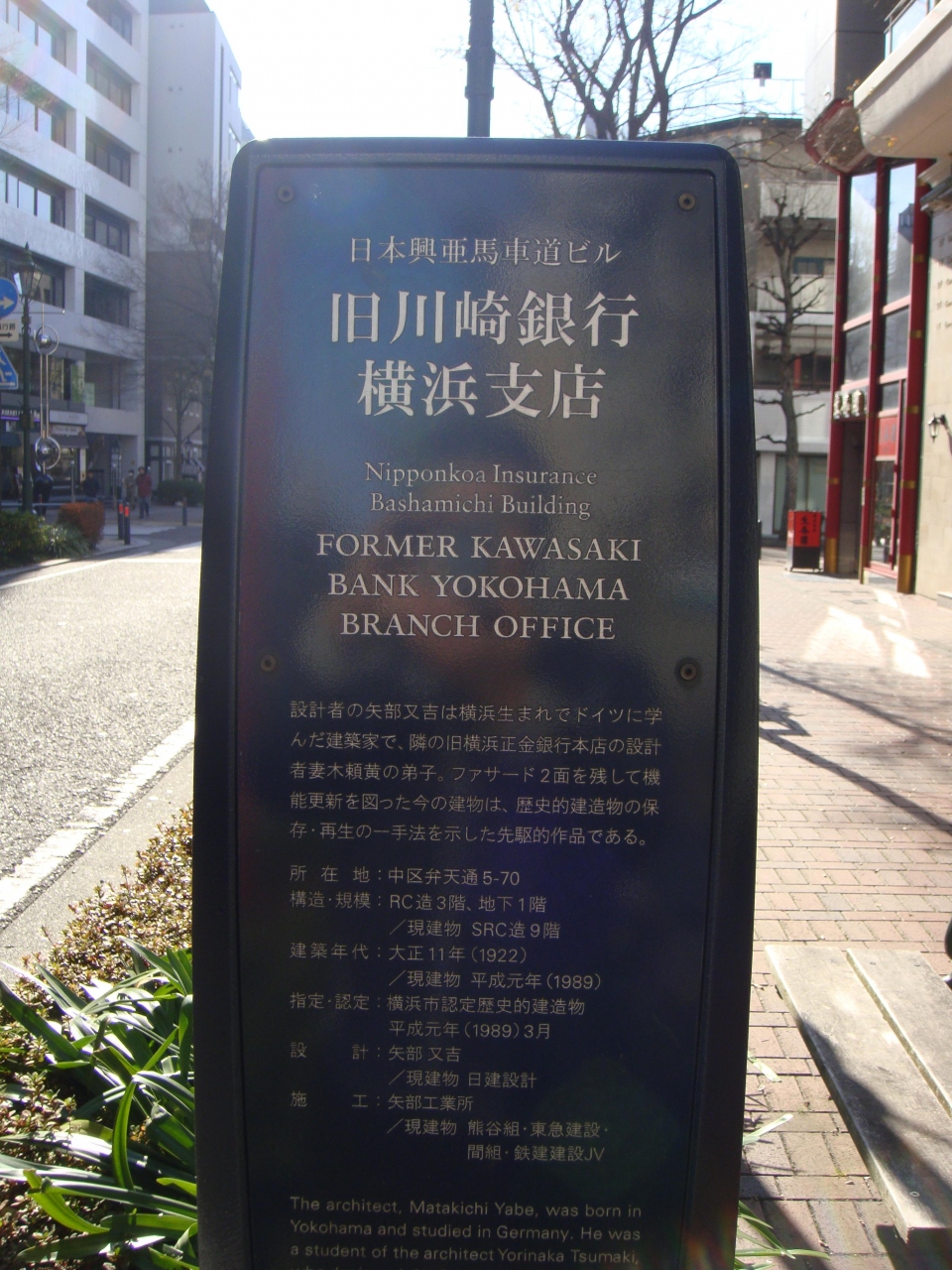 馬車道には多くのクラシックな建物があります。そのひとつ川崎財閥の中核銀行であった旧川崎銀行横浜支店は、ネオルネッサンス形式の3階建の石造建築で、横浜市の歴史的建造物認定の第1号になっています。現在は外壁を残し川崎財閥流れを汲む日本興亜損害保険の高層ビルとなっいています。