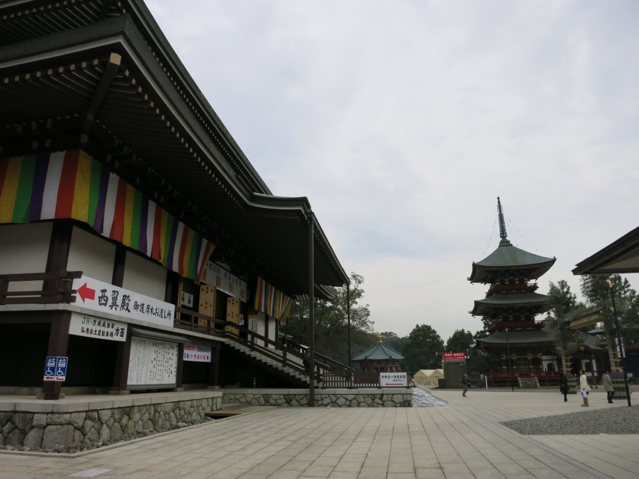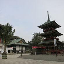 新勝寺の入り口、総門をくぐり、石段を上って、仁王門、そしてまた石段を上りきると、広い空間が広がり、大本堂に到着します。三重塔はその右手にあります。遠くからも見え、裏手に大きくそびえる塔は平和大塔で、三重塔ではありません。多宝塔です。
