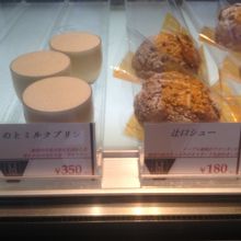七尾出身の辻口博啓氏の美術館&カフェです。祭日の昼過ぎに訪れました。カフェの入口には長蛇の列が。テイクアウトして宿でゆっくり食べるつもりだったので、直接店内へ入ったところ、テイクアウトも入口のボードに名前を書いて順番待ちでした。10分ほど待って、ケーキ売り場へ。残念ながらショーケースは品薄で淋しい感じ。ケーキはだいたい¥400~500位。今回は のとミルクプリン、辻口シュー、エーグルの3点を購入。どれも洗練された味わいで美味しかったです。海が見えるカフェもスタイリッシュな雰囲気でした。和倉温泉に行く際は立ち寄ってみる価値ありだと思います。
