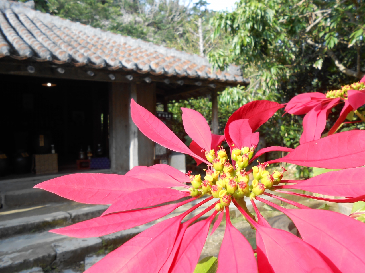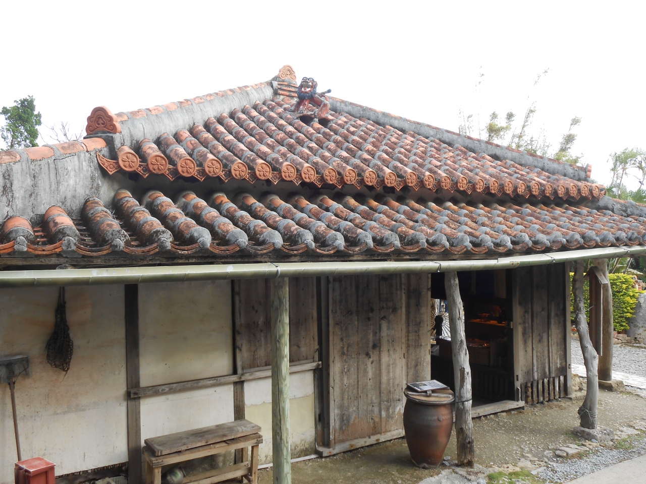 有料ゾーン:赤瓦にシーサーの古民家。沖縄らしい記念撮影に