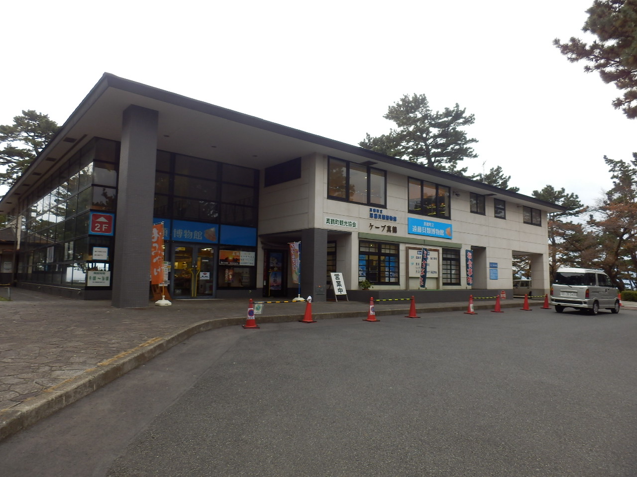 真鶴駅からの路線バスの終点がケープ真鶴です。岬の先端、眺めの良い場所にあるので、建物の中に入る前に、建物の裏手から海を眺めることをオススメします。建物内は1階にはお土産屋さんと食堂、2階には遠藤貝類博物館があります。お土産屋さんは品ぞろえが良く、地元の和菓子屋さんが作るきなこ餅が安くておいしかったです。