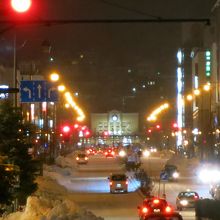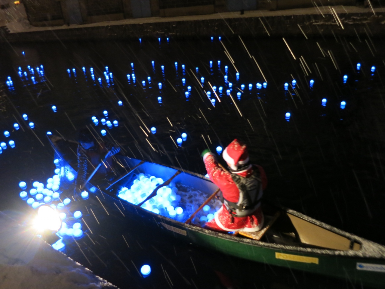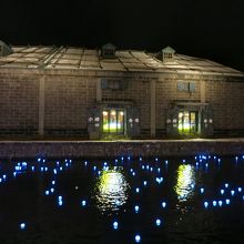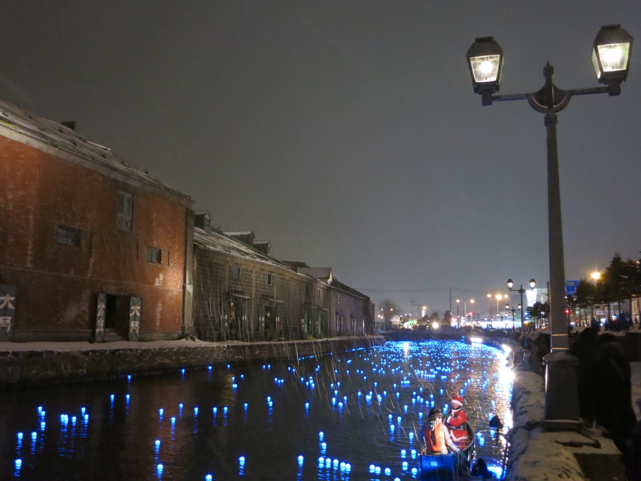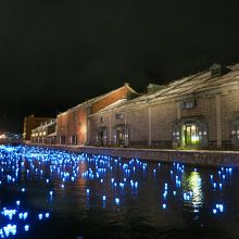 運河の水面に無数に漂う青色のLED電球(いのり星)。12月21日~23日(2013年)の間(17時~21時)、小樽運河のイベントとして、「冬の流星」が行われました。通常の時期のライトアップされた倉庫群や街の明りが映える運河よりも、はるかに美しく幻想的です。夜の運河を眺めるのであれば、寒いですが、ぜひこのイベント期間中に訪れることをおすすめします。場所は、小樽駅から駅前の中央通りをまっすぐに下りた中央橋の付近から東側200mほどの浅草橋付近まで。運河のたもとを歩行者専用の遊歩道が整備されていて、ライトアップされた倉庫群に無数の「星」で青く光る運河を眺めながら歩くことができます。気分が盛り上がったら、浅草橋のところでは、運営組織のテントがあり、「いのり星」の放流が1回¥1000円で行うことができます。