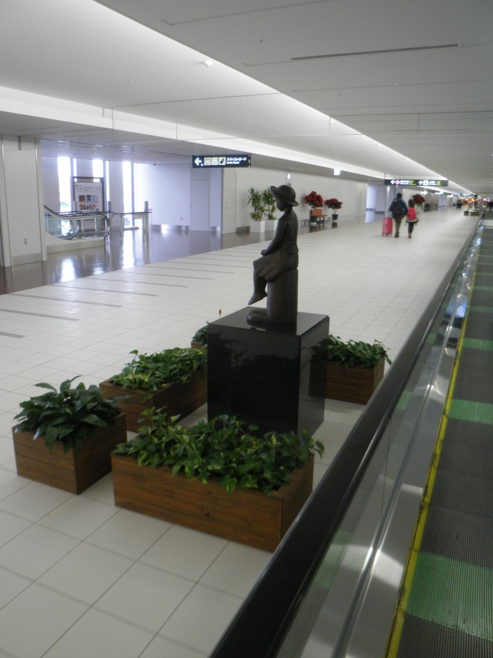 新千歳空港で飛行機の待ち時間があったので、空港内を散策しました。 空港内は国際線と国内線の2つのターミナルがあって、両方が通路でつながっています。 動く歩道のある階には、歩道に芸術作品が並んでいます。 帽子をかぶった女の子の像があったり楽しむことができました。