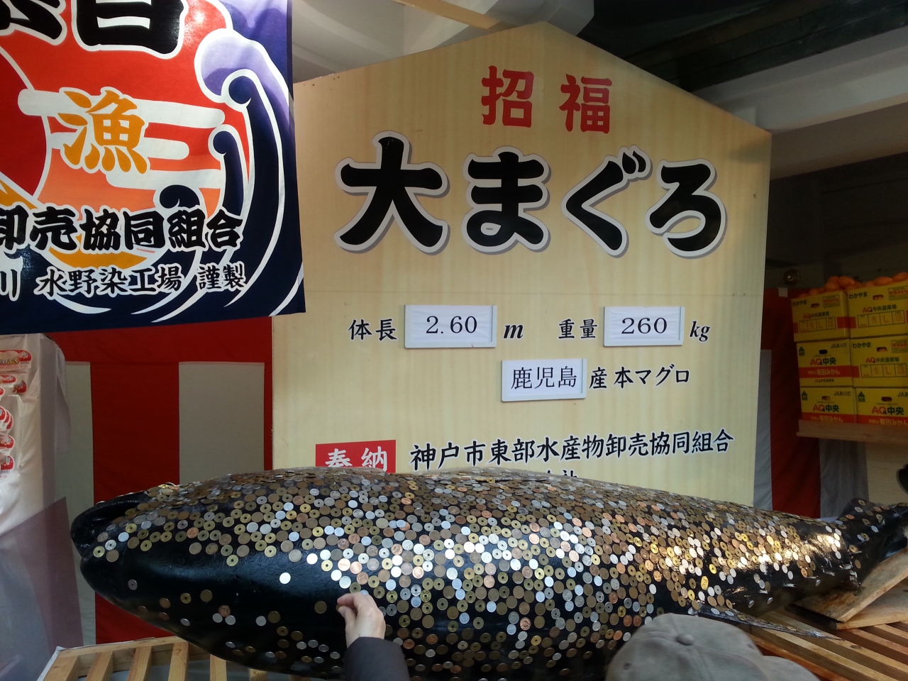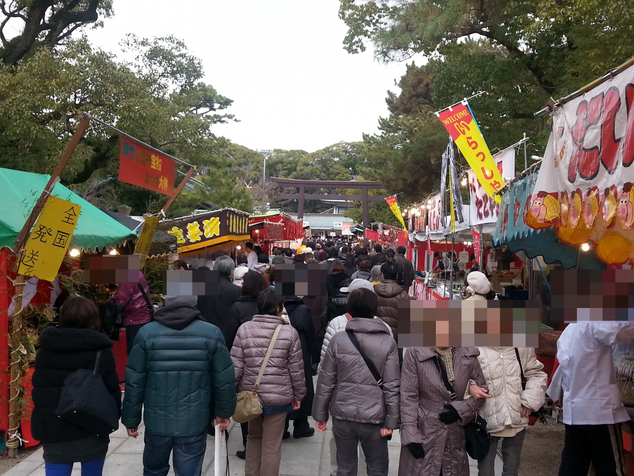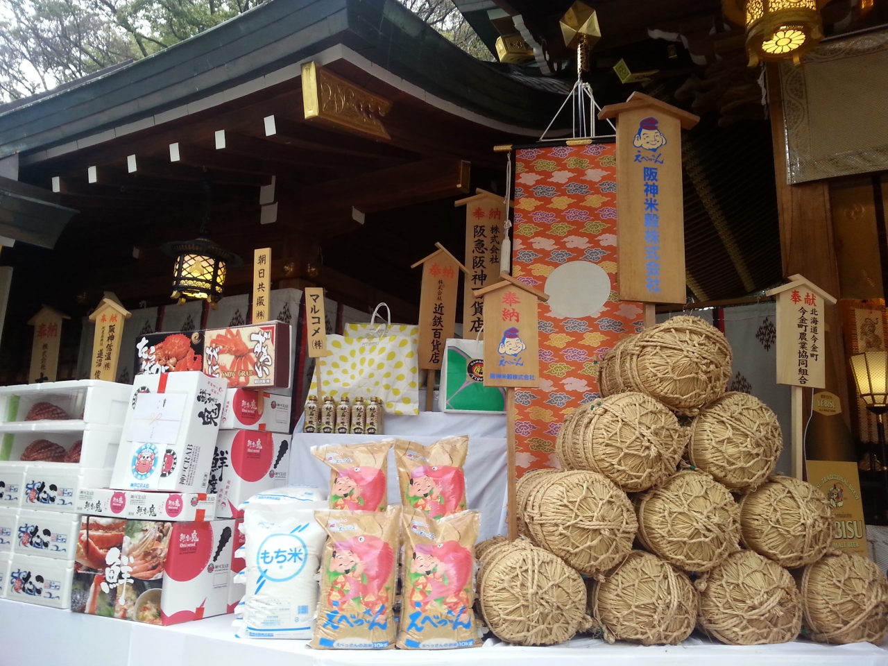 西宮神社はえびす宮総本社であり毎年1月9〜11日の3日間は多くの参拝客で賑わい、境内も歩行者道路となる周辺道路も様々な屋台が軒を連ね活気づく。本殿横に祭られた今年の大マグロの重量は260?であった。参拝は夕方から夜にかけて満員電車のような人混みで溢れるので朝が狙い目である。