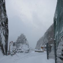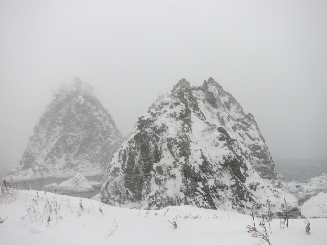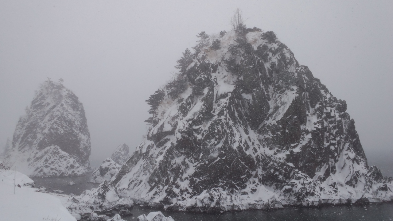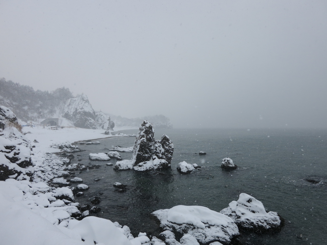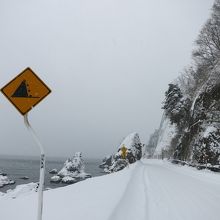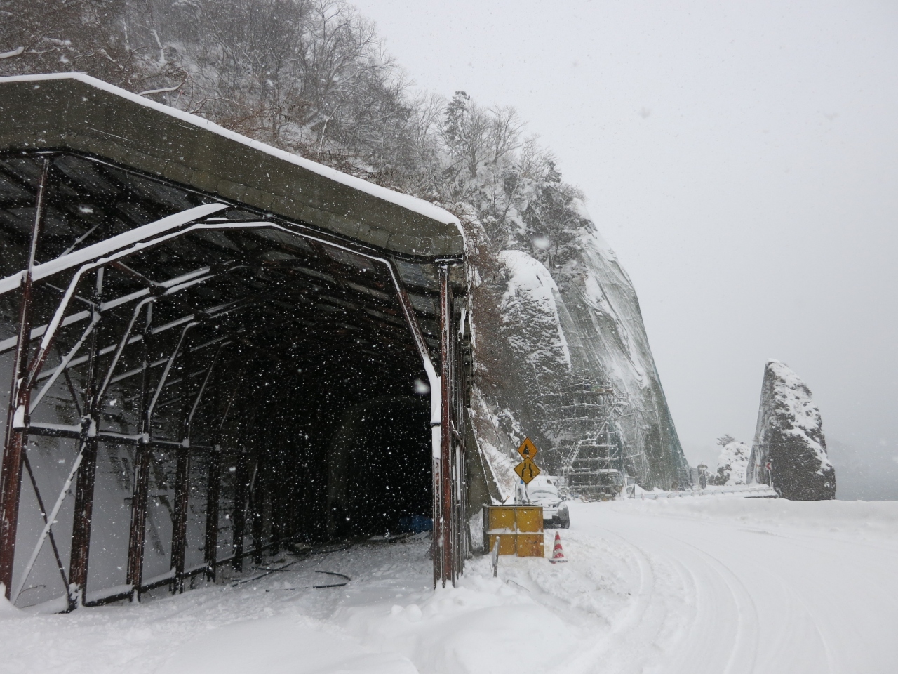 礼文~大岸間は4kmあまりとのことです。散策にもちょうどよく、徒歩で移動しました。国道からは離れた海岸線の隘路ですが、真冬でも数分に1台の割合で車も通ります。人も全くいないと思いきや、崖やトンネルの工事関係者が何人も作業をしていました。なお、別の機会にも訪れたことがありますが、日が暮れてまもなくの淋しいはずの海岸に人の気配がします。ところどころ明りが灯っていて、夜釣りの名所でもあるようです。なお、豊浦町などの周辺一帯は噴火湾の海と夕日がきれいなところ。天気が良ければ対岸の駒ケ岳も見える風光明媚な場所です。夕日の時間にもぜひ訪れてみたい場所です。