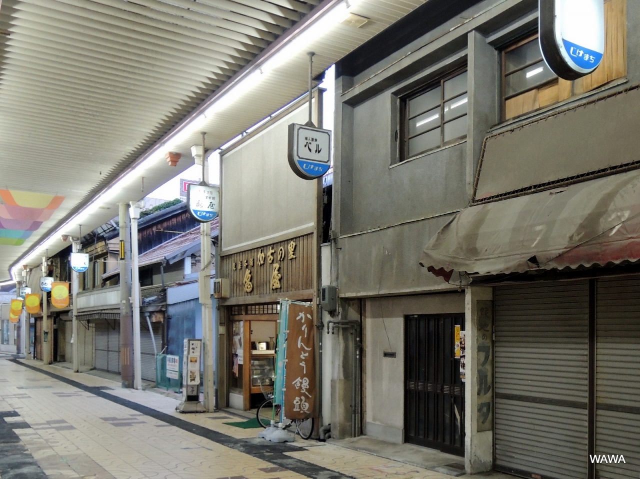JR加古川駅前のニッケパークタウンの南西に長く続くアーケードの「寺家町(じけまち)商店街」には伝統的な店構えの商店も多く、昭和レトロな町並みを楽しめる場所です。お菓子やお土産品を扱うお店も多いので買い物などにも便利。