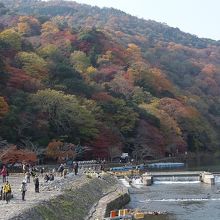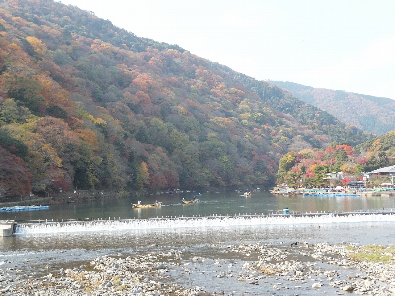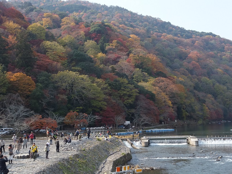 桂川にかかる橋 桂川をバックにした嵐山の 紅葉