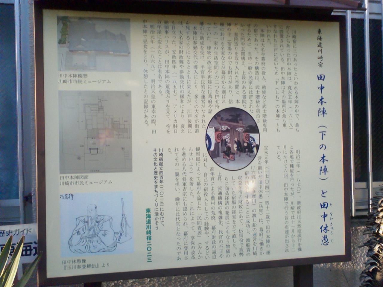 旧東海道を多摩川方面に進み、東海道かわさき宿交流館の先、道路左側の歩道に案内板がある。