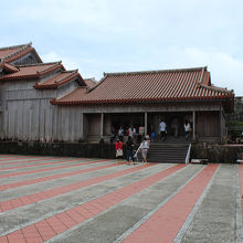 首里城内の見学コースの御庭から建物に入る最初の所です。中は博物館のようになっており、漆器や美術品などが展示されています。御庭から見て右側が番所、左側が南殿ですが、この建物は他の中国風の建物とは異なり、壁が赤く塗られていませんが、日本風のものとして塗っていないようです。