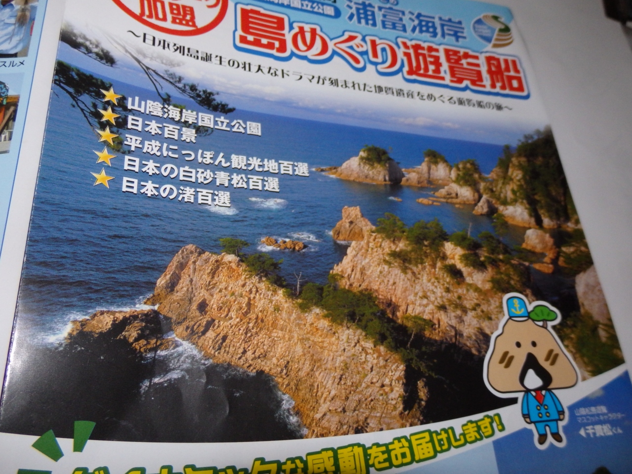 浦富海岸(うらどめかいがん)は鳥取県岩美郡岩美町にある約15キロメートルにわたるリアス式海岸で国の名勝、天然記念物に指定され「日本百景」、「日本の白砂青松百選」、「日本の渚百選」、「平成にっぽん観光地百選」などに選ばれている日本海沿岸の自然景勝地。海岸西部には海水等の侵食による花崗岩の断崖、奇岩、洞門が続き、海面上に大小の島や岩が散在する風景が宮城県の松島に似ていることから「山陰の松島」と呼ばれることもある。浦富島めぐり遊覧船乗り場は鳥取県岩美郡岩美町大谷2182.にあり利用時間は9:10∼16:10.浦富島めぐり遊覧船は. 11月までで11/28以降の出発は「山陰海岸ジオパーク巡り」となる。一般料金は\1,200 。