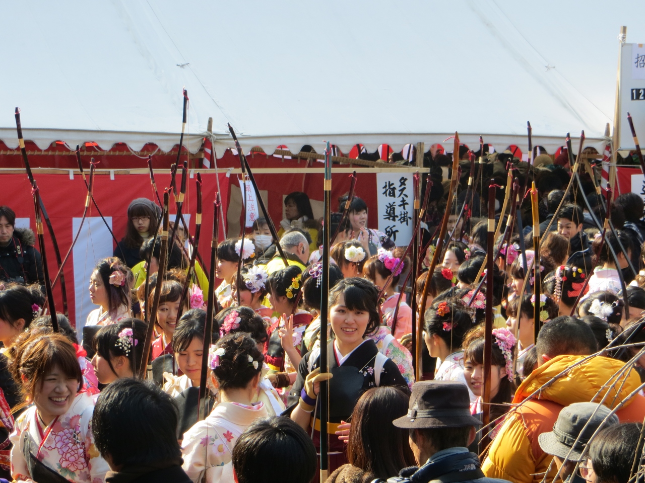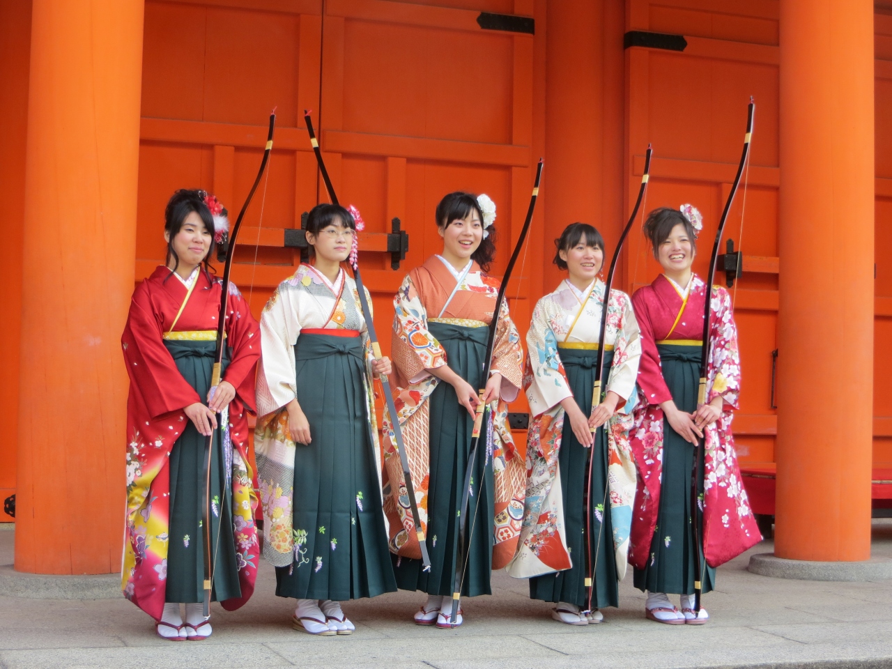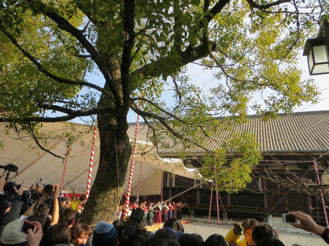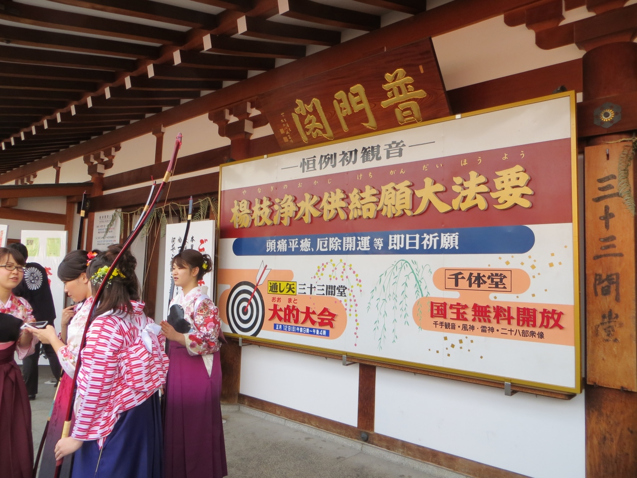 1月12日(日)は三十三間堂で通し矢と楊枝のお加持でした。この日一日三十三間堂は無料開放されていて所蔵されている沢山の国宝の仏像を拝むことが出来ます。本尊の巨大な千手観音像はもちろんのこと、風神・雷神と二十八部衆をゆっくり拝観し至福の時間を過ごすことができました。