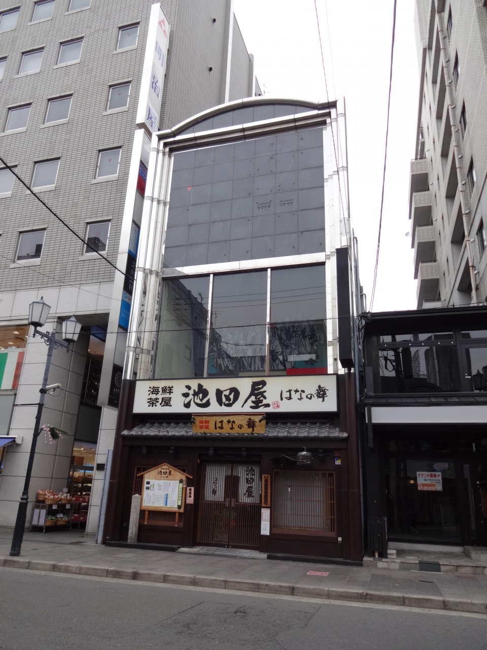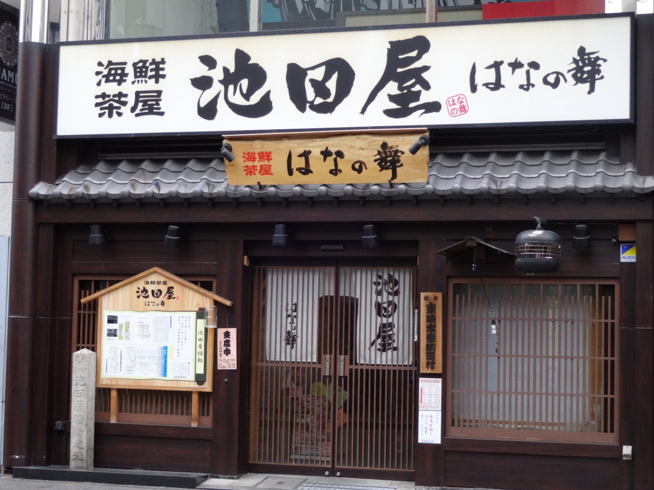 今は、入り口に石碑が立つのみで、建物は居酒屋チェーン店「海鮮茶屋 池田屋 はなの舞」となっています。