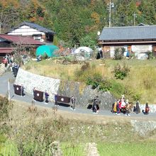 昼食時間には腰掛けて、輪っぱの弁当を広げる人、竹の皮に包んだ握り飯をほおばる人など昔さながら風景を再現しています。