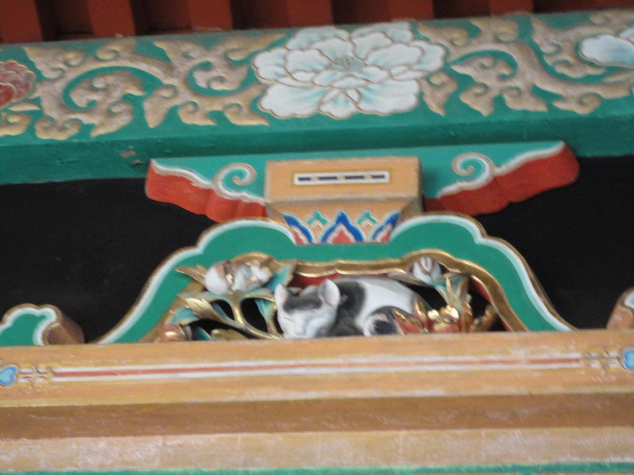 奥社入り口にある眠り猫は奥社を守っていると言われ、その踏ん張った前足はいつでも飛びかかれる姿勢で徳川家康を守っていたとも伝えられています。また裏側には猫の天敵であるスズメの彫刻があり、これはスズメが踊っていても猫は寝ている状態で、平和を意味しているようです。