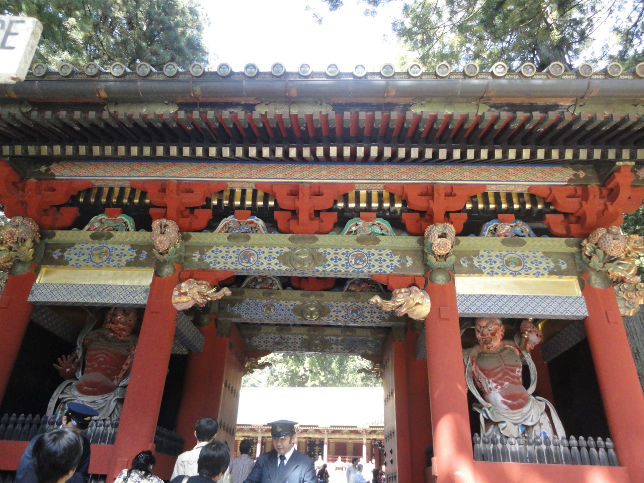 東照宮最初の門で、東照宮五重塔広場の正面に立つ朱塗りの門。左右には、「阿」(あ)、「吽」(うん)の一対の仁王像が安置されていて、仁王門とも呼ばれているそうです。後ろには金色の狛犬、柱の上部には動物などの彫刻がありました。