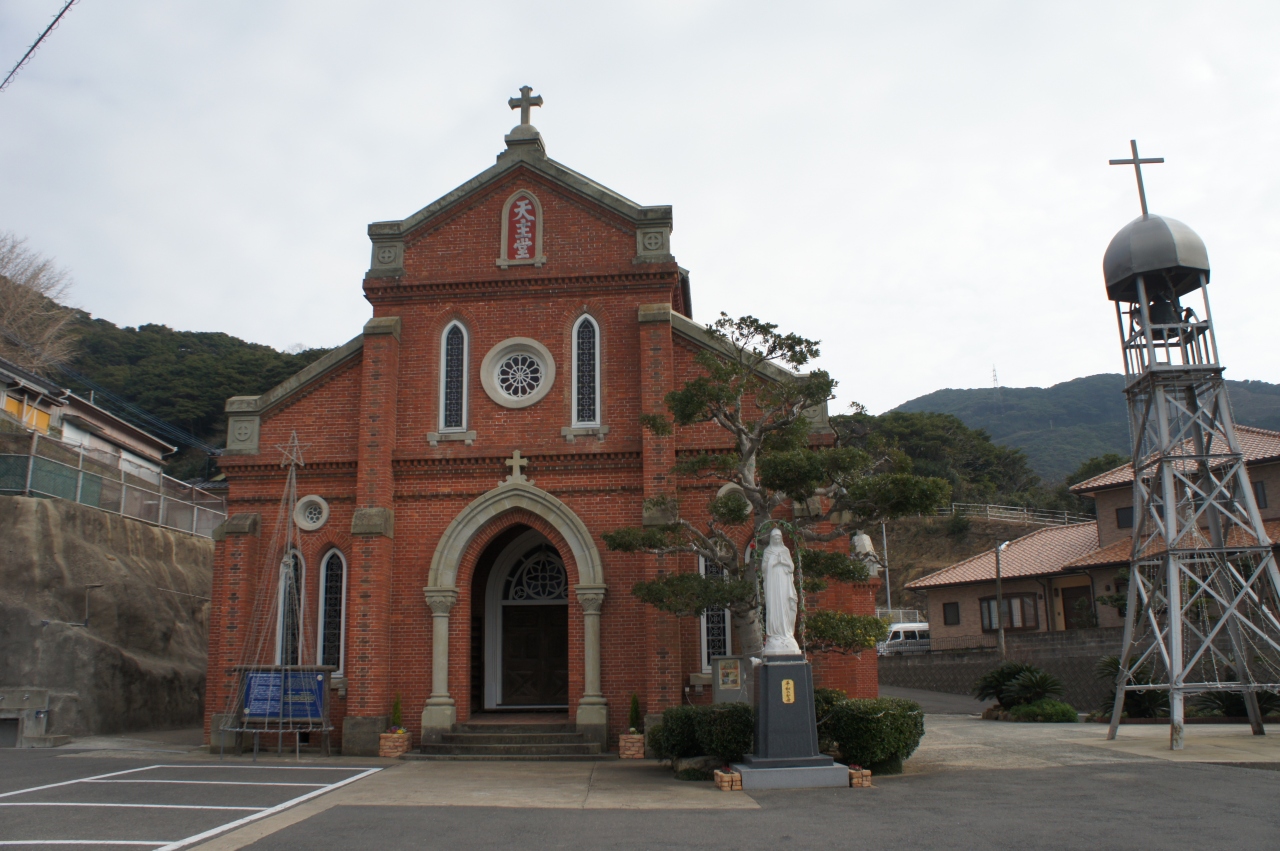 中通島の有川港から車で15分ほど、鉄川与助設計の煉瓦造り教会。正面にはバラ窓や縦長アーチ窓によって飾られ、入り口は植物装飾柱頭のある石造り柱があって煉瓦とのコントラストが美しい。内部は三廊式でリブ・コールト・コウモリ天井といわれるアーチが特徴的。静かな教会は国指定の重要文化財であるが、住民に愛されていて清掃は行き届いていた。
