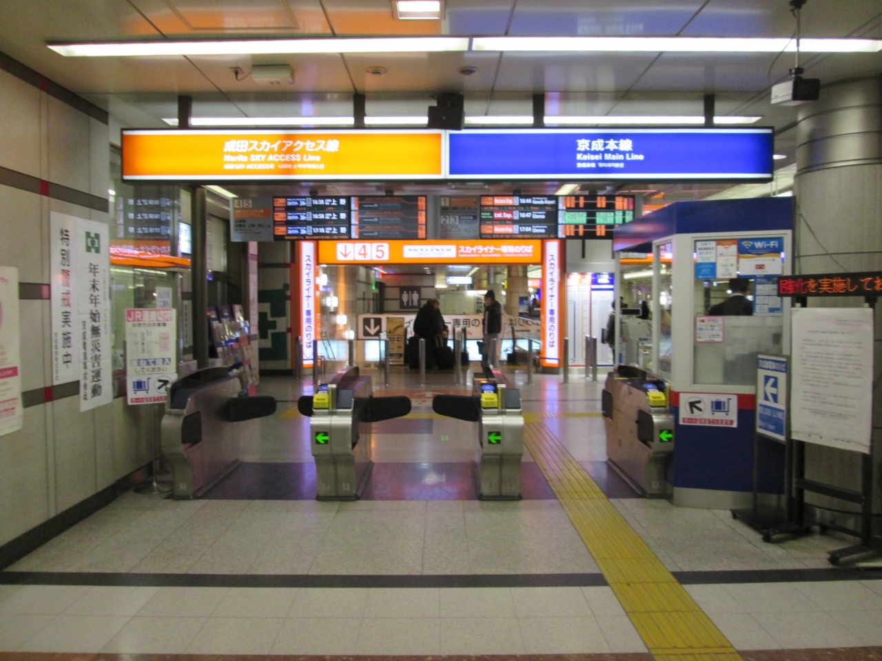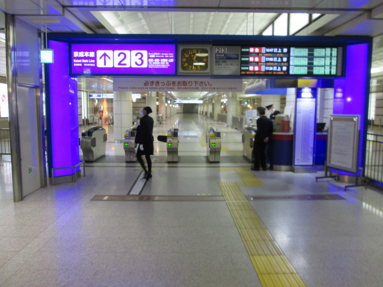 成田空港及び空港第二ビルには同じホームに京成本線と成田スカイアクセスが乗り入れています。初心者や外国人に対しても分かりやすいように線を色分けしています。京成本線は紫色、成田スカイアクセス線はオレンジ色です。