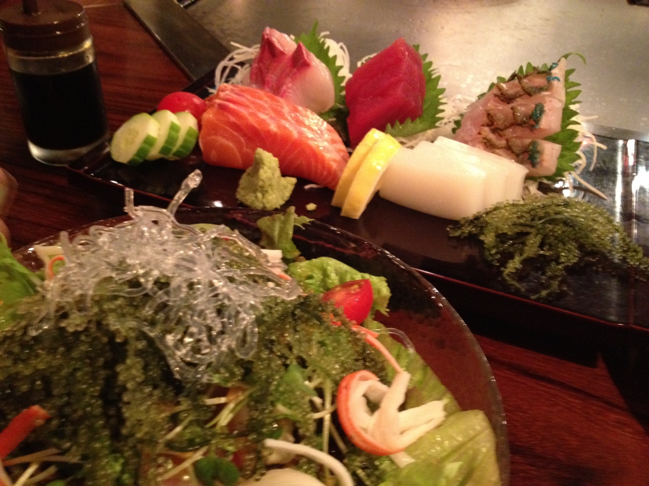 かりゆしビーチリゾートホテルに宿泊し、近くの居酒屋へとこちらに来店しました。海物語本店で島唄を聴きながらと思っていたのですが、店の前は長蛇の列・・・1時間以上待つとの事で本店横の2号店ならすぐ入れるようでそちらに入店する事に、カウンター席の前には鉄板があり子供づれには危険かも、店内は薄暗くムーディーな感じでした。料理のお値段もなかなか・・・