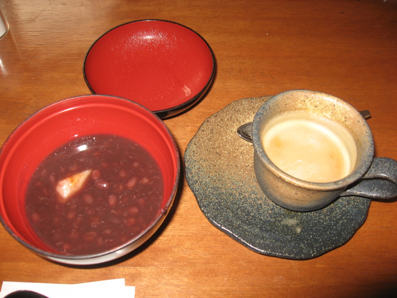 こちらのランチは週替わり(土日はない)で今日はメインは親子天丼でした。親は鶏肉、子は玉子の黄身を天ぷらにして、その他の野菜も加わって天丼になっていました。他に野菜の生春巻き、切り干しの煮物、タケノコの田楽味噌、漬け物、デザートにお汁粉付き、これで1、050円はうれしいお値段。