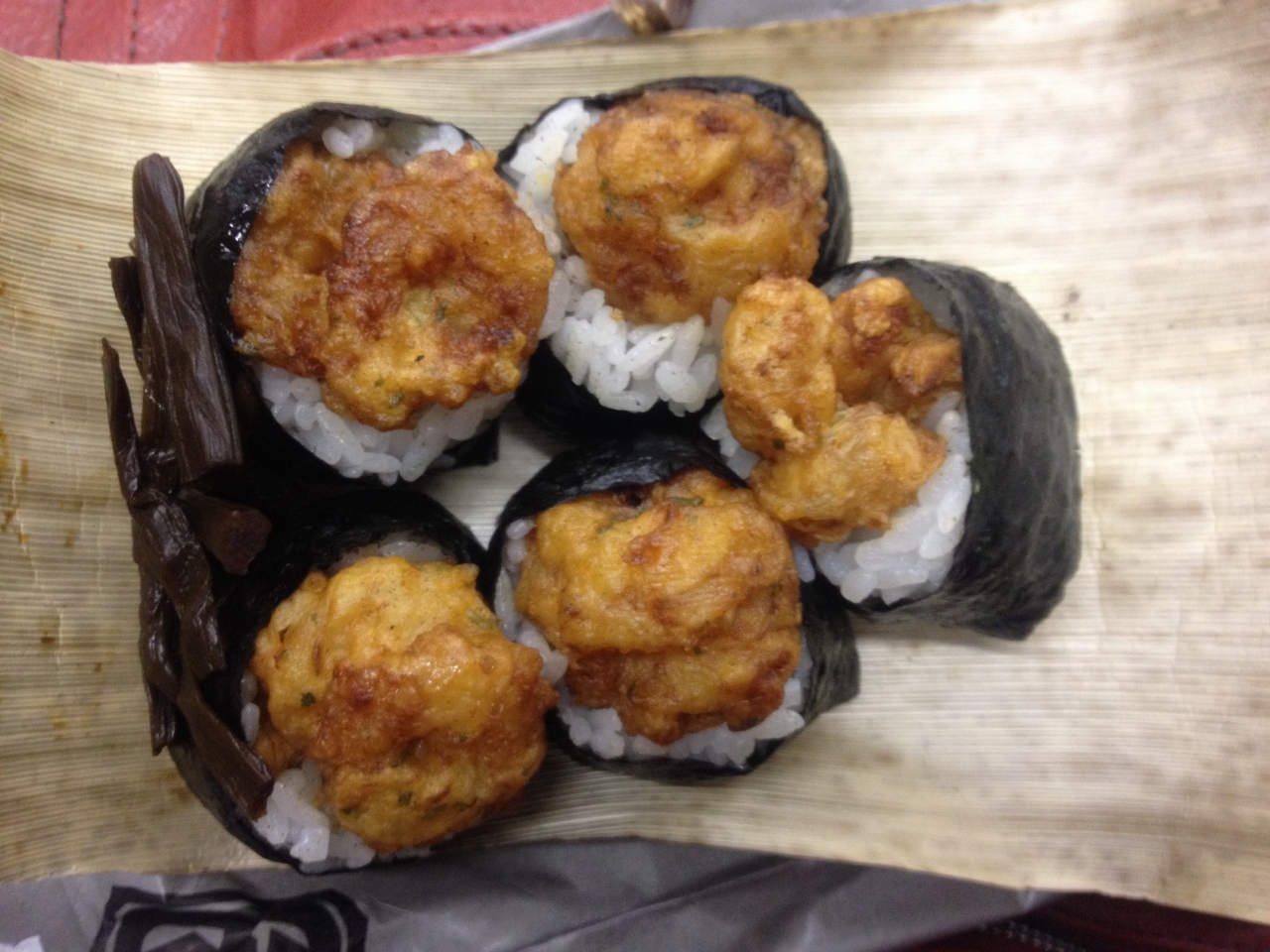 2口くらいで食べれてしまう小ぶりなもので、5個だけじゃ夜ご飯ではお腹すくかも。プラス250円位で少しおかずがつくので、セットの方がいいかもしれないなと思いました。天むす3個とおかずで天むす5個と同じ値段でした。