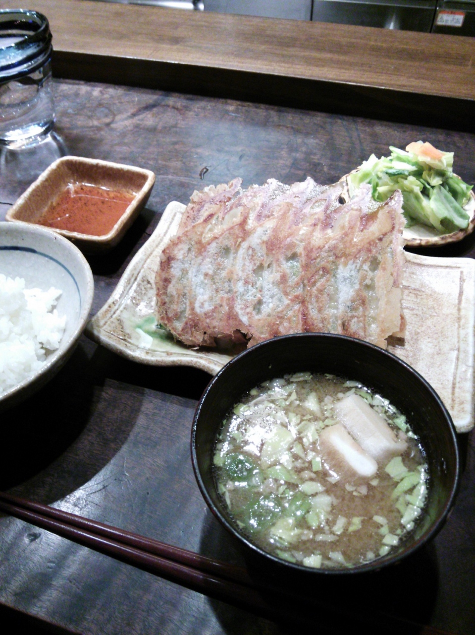 ぎょうざは2人前ですが小ぶりなので、全然大丈夫です。あっさりしたタレと、黒七味がとてもいい味わいです。付け合わせのキャベツの浅漬けと味噌汁も美味しく、女性スタッフさんの笑顔とCPの高さに大満足の夕食となりました。
