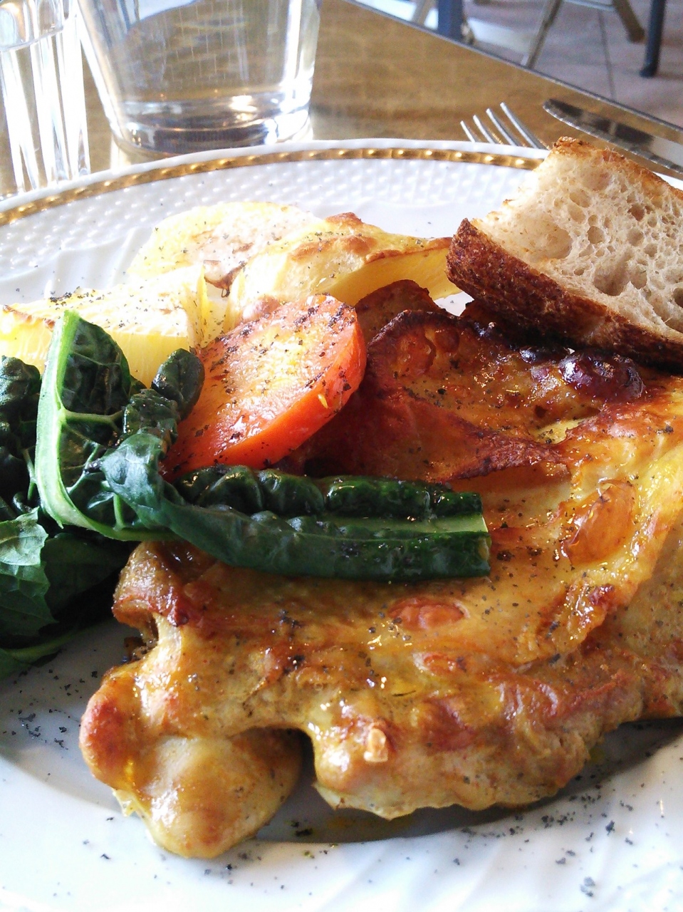ワンプレートにチキンと野菜、パン1切れという内容。美味しいけれど、1800円なら1回食べれば気が済んだという印象。