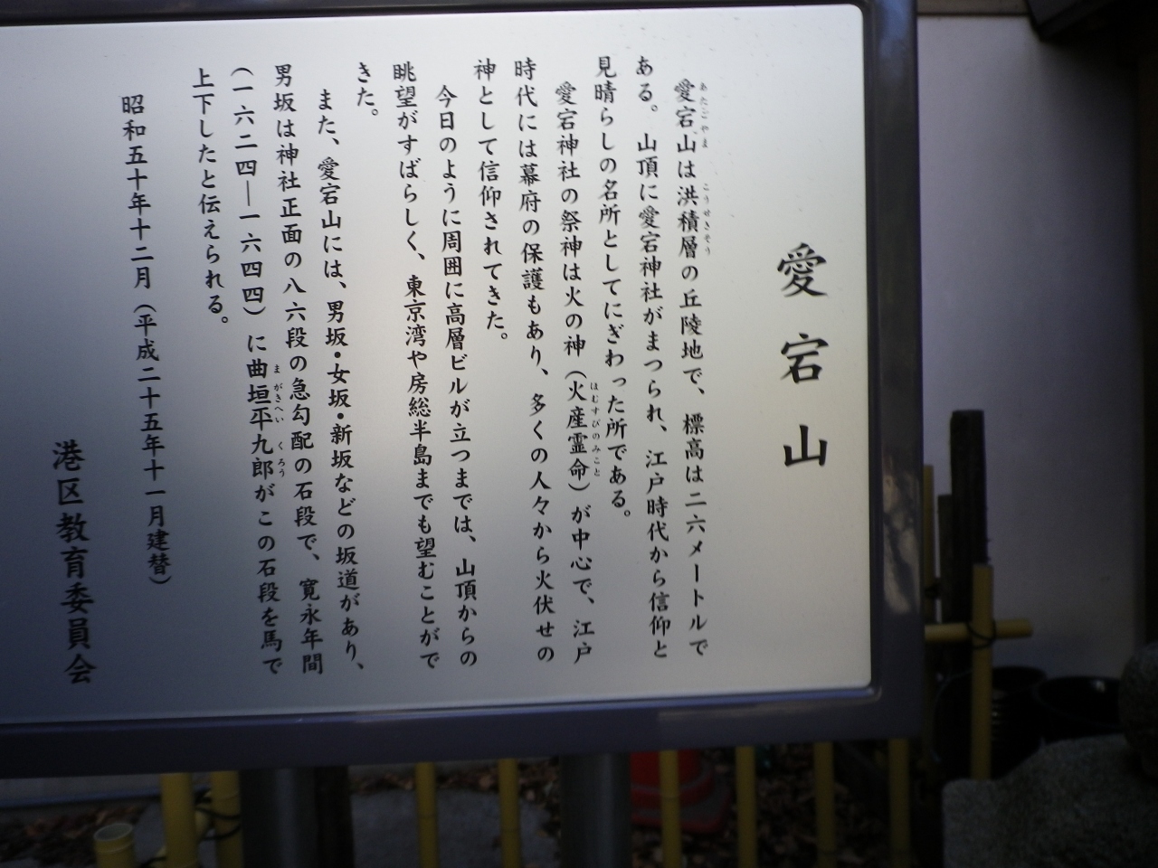 愛宕神社は防災に霊験あらたかな神社で総本社は京都の愛宕神社である。86段ある階段は一気に登るのはなかなかきつい。勾配も結構急で、馬で上り下りした人が本当に居たのかと感心してしまう。平日にも関わらず結構な人がお参りしていた。