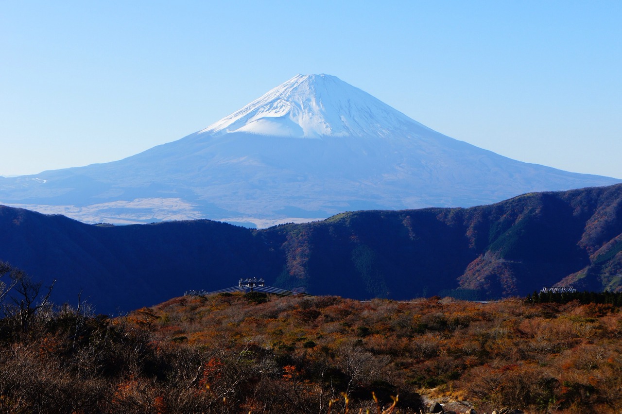 大涌谷から眺める富士山は本当に美しいです。私が行ったときは、雲ひとつなく澄んだ空に、冠雪した富士山がはっきり見えました。大迫力です。また、硫黄の匂いと噴煙をあげる景色を楽しむことができます。