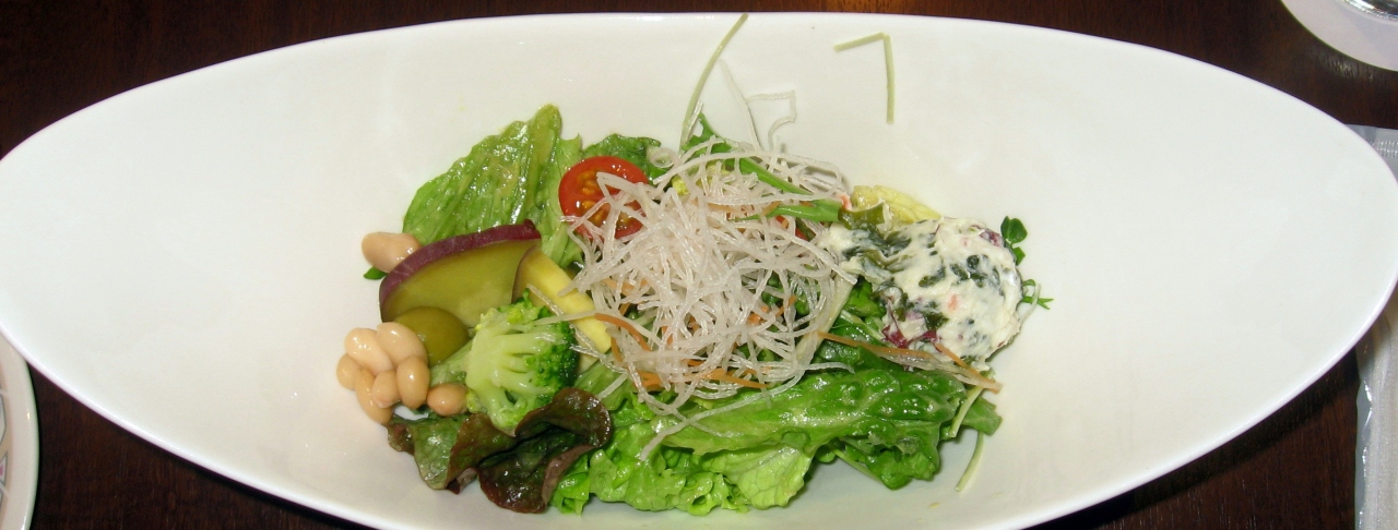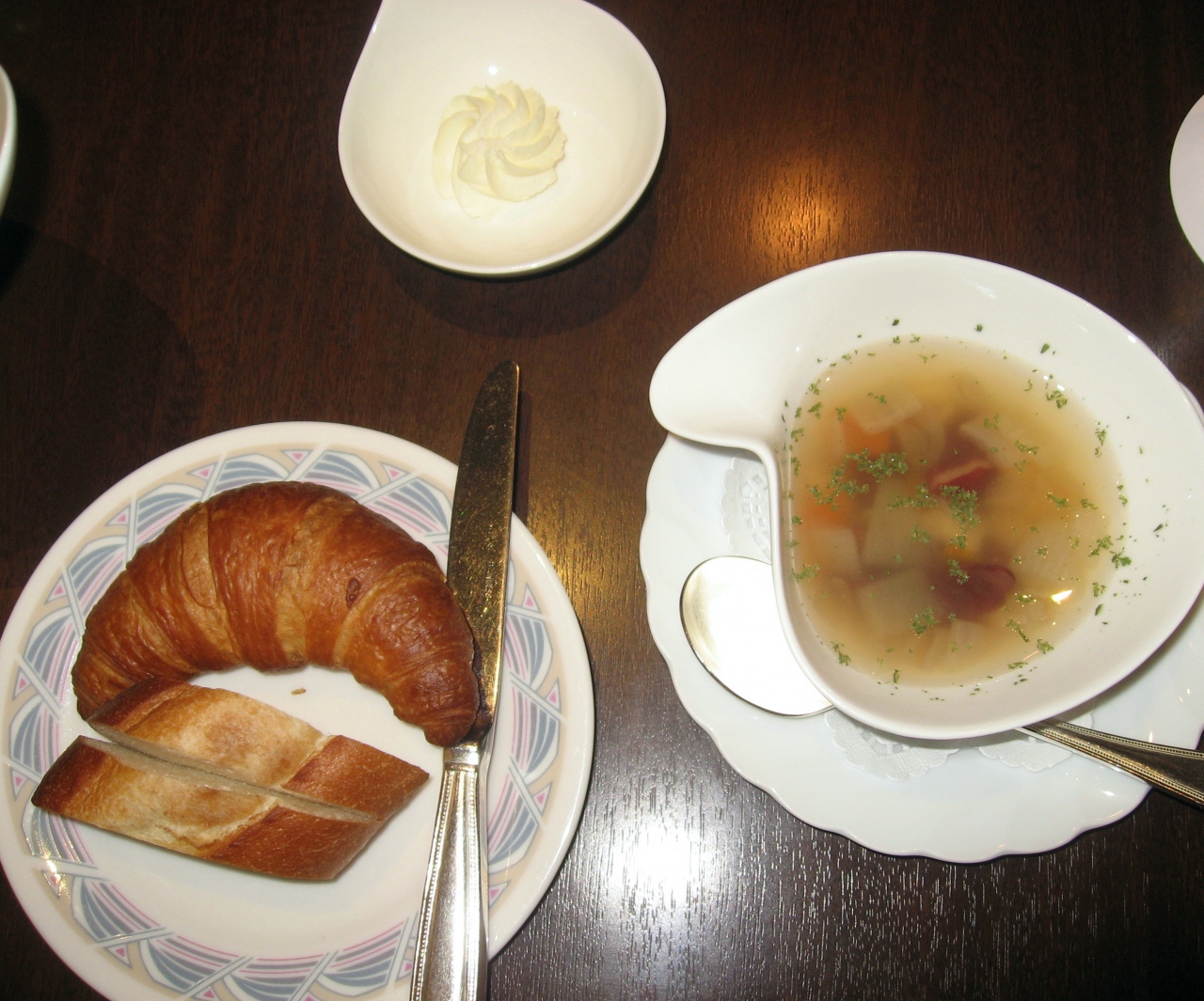 このコースは最初に野菜たっぷりのサラダが白い楕円のお皿で出され、次は豆と野菜のコンソメスープ。すてきなお皿と優しいコンソメ味に満足。魚コースのメインは白身魚と野菜のクリーム煮が小さなダッチオーブンで饗されました。友人の肉コースはビーフカツでウィーンの名物、シュニッツェルのような感じでした。