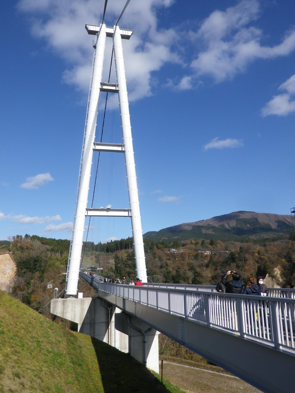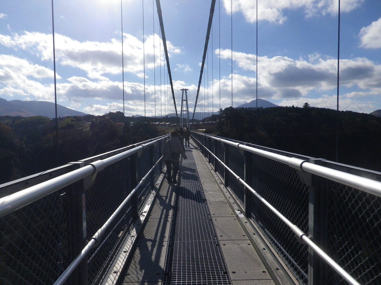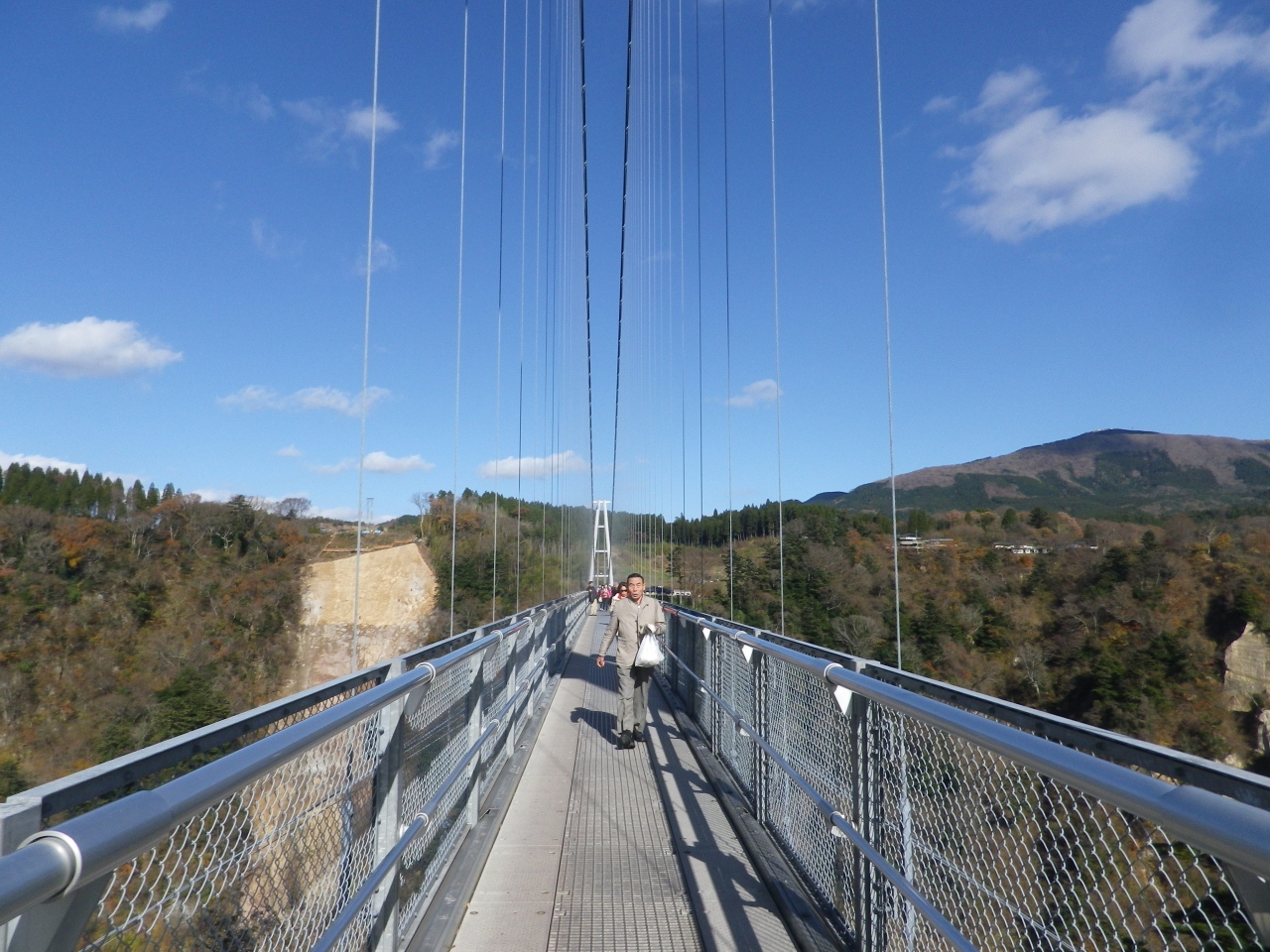 大分県九重にある観光吊橋で、高さ173m・長さ390mある日本一の大吊橋です、吊橋上から日本の滝百選に選ばれた「震動の滝」や九重連山など山々の景色が楽しめます、橋の両サイドにはお土産屋などあり、多くのツアー客も来ている観光スポットになっています、入場料500円で夢の体感をしてきました。