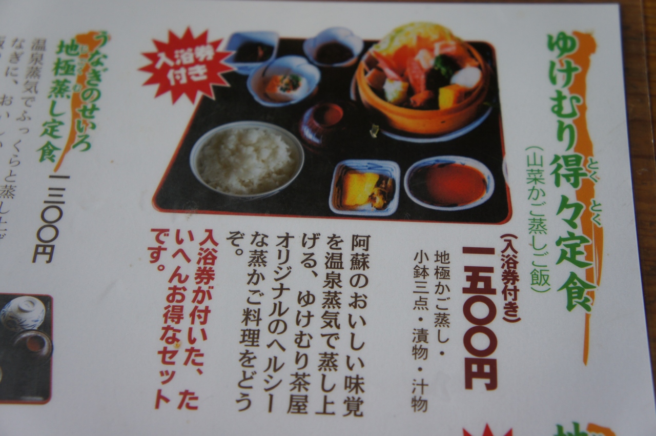 地獄蒸し定食を食べました。メニューには「温泉入浴券つき1500円」とあるのですが、お風呂は別のところで入りたいと思い聞いてみたら1200円でできますとのことでした。メニューをよく見ると「メニューにない組み合わせにも対応します」とありました。入浴すると休憩もできるらしく、奥の座敷には昼寝をしている人がたくさん転がってました(笑)