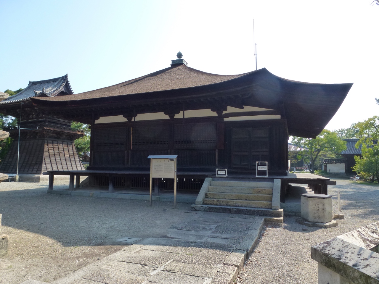 私も来るまで知らなかったのですが、「西の法隆寺」と呼ばれる程素晴らしい寺院で、境内には国宝の建物が2棟、国重文の建物が4棟もあり、写真の「太子堂」はその国宝の建物です。