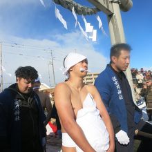 訪れた時は気温-7℃。海水温7℃の海へと裸で入っていく行者と異なり、十分な厚着が必要です。みそぎの最後で、観客の頭上にもありがたい冷水が撒かれますので、フードや帽子があるとよいかもしれません。