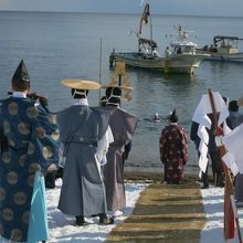 毎年、JR木古内駅の駅前の通りを海までまっすぐ500mほど進んだところにあるみそぎの浜と、海とは反対側の駅の裏口から出て、これも500mほどのところにある佐女川神社で開催される道南の奇祭です。日にちが決まっているようで、1月13日~15日の3日間、各所で神事が執り行われます。