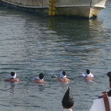 中でも、14日の夜に佐女川神社で行われる水ごりと、15日の昼ごろみそぎの浜で行われるみそぎは、4人の行者が海中に入ったり、水をかぶったりと、祭りの見どころ。特に15日のみそぎは、観光客や地元の人などでとても混雑します。人垣ができて、行者が沐浴する様子が見えないこともあるので、早めの会場入りが必要です。なお、仮設の展望席が2か所に用意されていましたが、1か所は「みそぎガイドウォーキング」(木古内町観光協会主催。祭りの数日前までに申し込み。先着30名。参加費は無料のようです。)参加者専用となっていました。また、写真撮影者の許可を受けると、腕章をして、一般の人は入れない浜まで降り立ち、間近で撮影することができるようです(費用など不明。詳細は観光協会等へ問い合わせ)。一般席からだと、どうしても人垣の隙間かからの眺めだったり、行者のいる波打ち際まで遠く、小さくしか見えなかったりします。