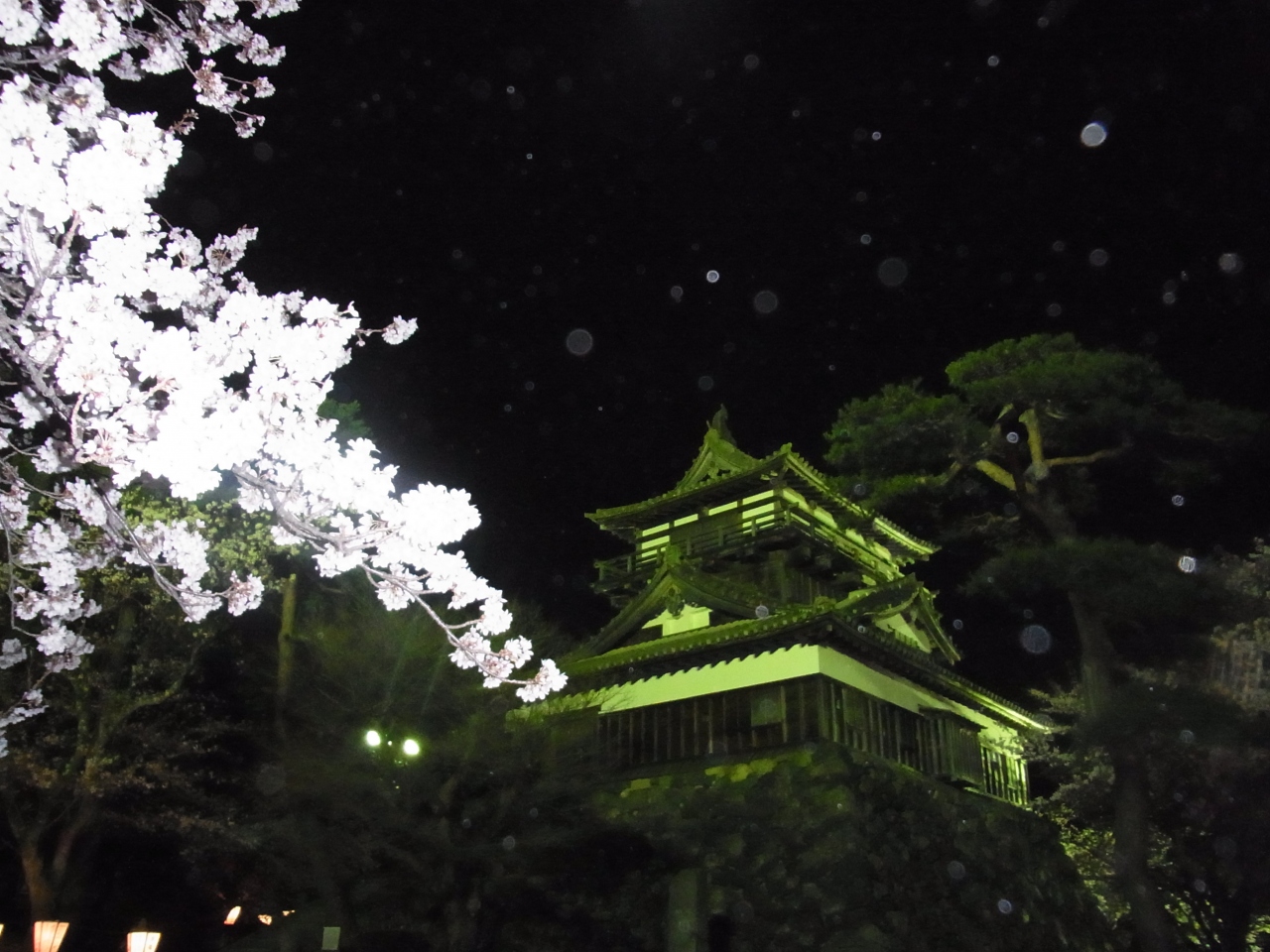 以前に行っていいお城だと思っていました。金沢からの帰り夜になっていたにですが、ちょっと立ち寄ろうと思ったら夜桜見物をやっていました。早速駐車場に車を停めて見に行きました。 このお城にしては結構な人でしたが、それでもゆっくり夜桜を堪能できました。