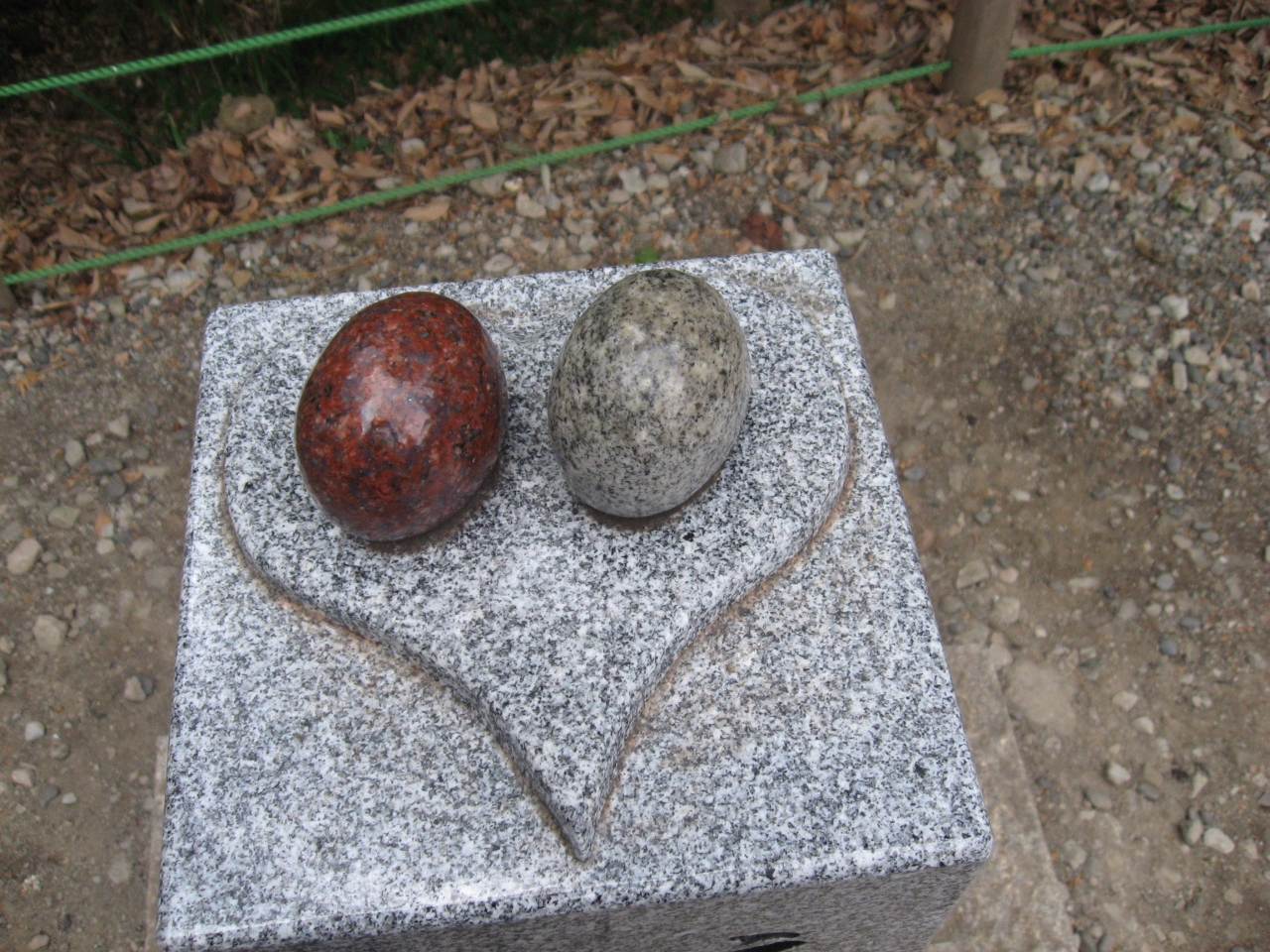 神社の前の参道は縁結び通りになっていて脇に置かれている石柱は上にはハートと石のおむすびがありました。