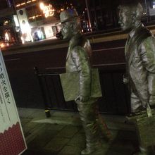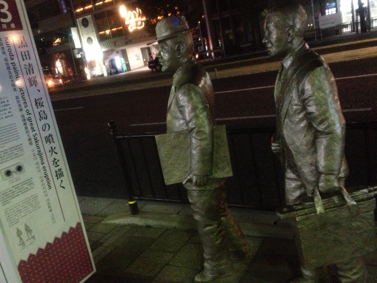このモニュメントは、噴火中の桜島をスケッチするため、黒田清輝が弟子の山下兼秀と港に向かう様子を再現しています。