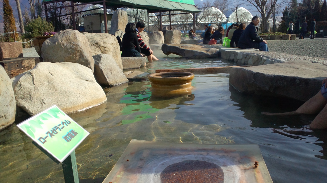 今回は正月イベントとして客も参加する餅つきがあり、私たちが足湯に浸かっている間にお餅をきな粉餅や餡子餅にしてくれて、足湯の後で美味しくいただきました。